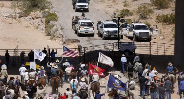Federal agents and contract cowboys herding cattle toward a corral were stopped by a picket line of self-styled militia perched on a high Interstate 15 bridge, pointing military-style AR-15 and AK-47 weapons at them.