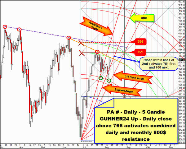 If palladium manages to overcome the short-term orange dotted daily down trendline, it will be likely to go quickly up to the next higher purple dotted daily down trendline = 760$. A daily close above 766 - an important horizontal GUNNER24 Resistance starting from the upper line of the 2nd – would activate the 800$ target in the daily and monthly time frames!