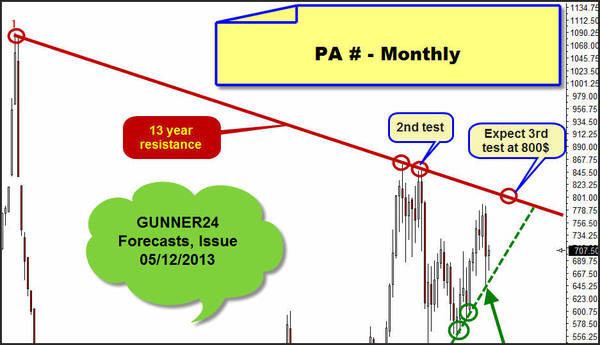 To round off the big picture let’s have a look at palladium, the strongest precious metal in 2013. It’s the only one of the 4 precious metals that comprises a tight plus for 2013: +5%. The world-wide surplus in demand prevented palladium this year from being beaten down the way silver and gold were. Target for 2013 is and keeps being the 800$, as analyzed already most extensively in the free GUNNER24 Forecasts of May 12, 2013: