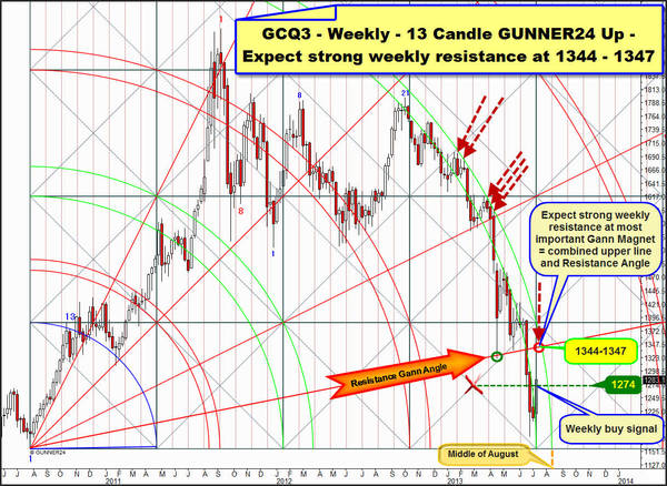 Well, next week at first the daily down trendline (purple) is supposed to break upwards. A daily close above 1322 will confirm that finally. But gold is not going to fly before the first clear close above the upper line of the 2nd double arc. A daily close above 1330 during the next 5 trading days will generate this next important buy signal. Not before that the 1387 = combined daily and weekly resistance will be finally confirmed. A daily close above 1330 during the next 5 days would activate the 1387 at the 3rd double arc resistance till the end of August 2013.