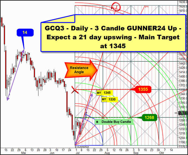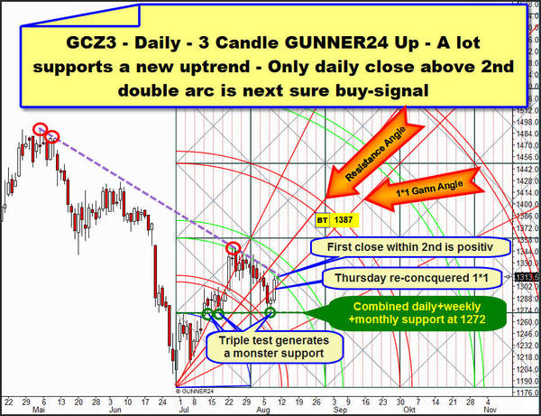 The consequences are far-reaching. On the one hand, technically August as well as September is not likely to go beneath the 1272!!! But if it does, prices below 1272 during the next 4-6 weeks would be a new, lasting sell signal after which subsequently the actual correction low at 1182.60 will be headed for.