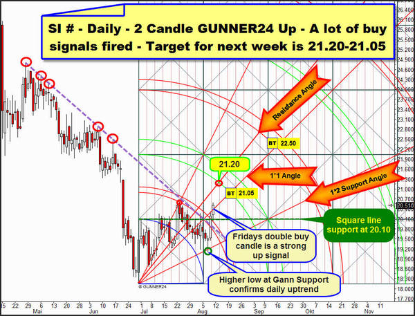 Gold is showing a 3 day initial impulse from the lows. Thus gold is stronger than silver. On Thursday gold achieved a double buy candle on daily base. Within one day the Blue Arc as well as the upper line of the first square was broken upwards finally. On Friday gold tested back only the upper line of the first square. Thus, altogether gold is stronger than silver, therefore gold and silver are very likely to be in a countertrend bounce now.